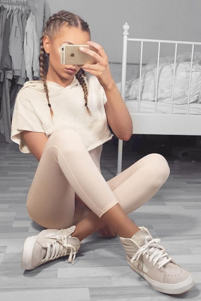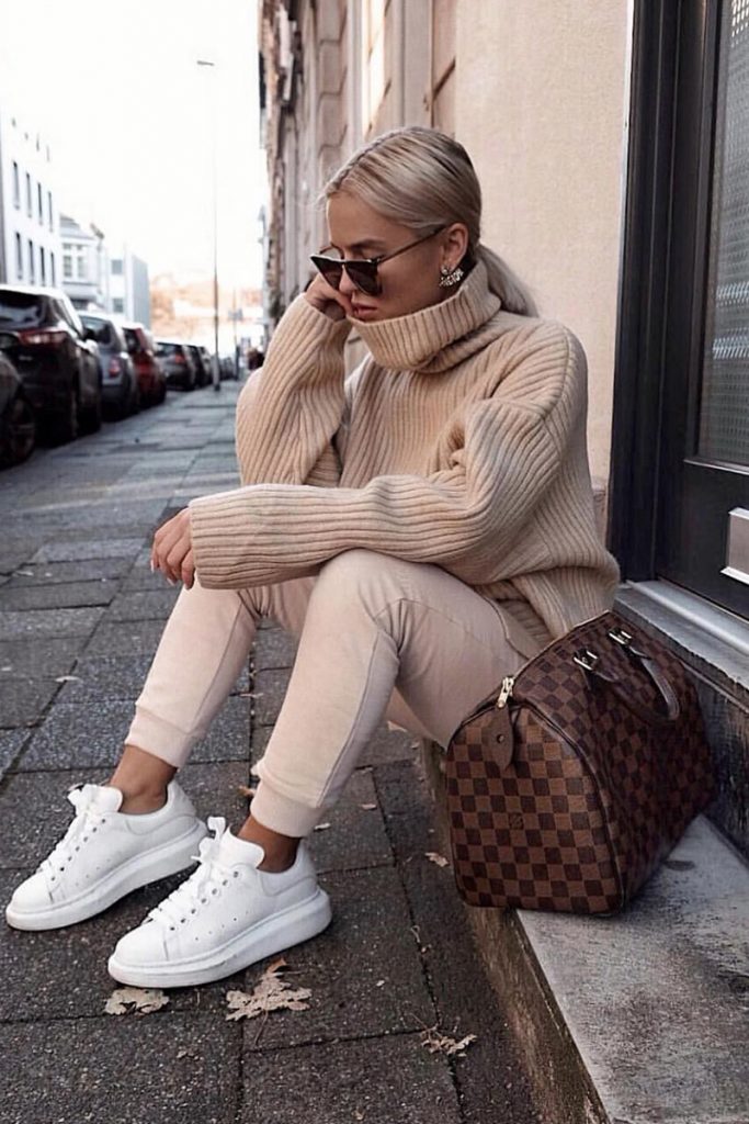 Puedes armar un outfit del estilo atheisure, combinando unos pants nude, con un suéter camel oversized y un lindo par de tenis, estas tonalidades son infalibles.