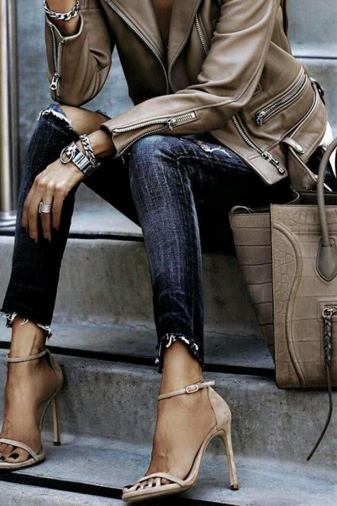 Las chamarras tipo biker son un clásico que se reinventa cada temporada. Si estas chamarras son de tus favoritas, puedes buscarla en camel a la hora de comprar la tuya. Una playera básica y accesorios en nude mantendrán el foco visual en esta prenda.