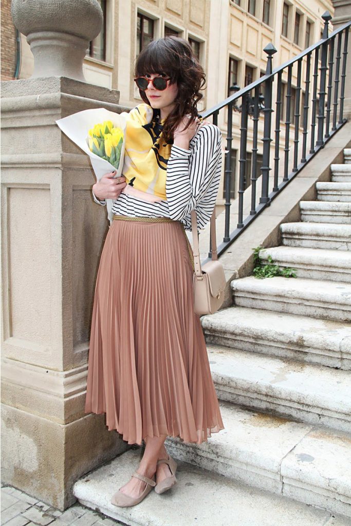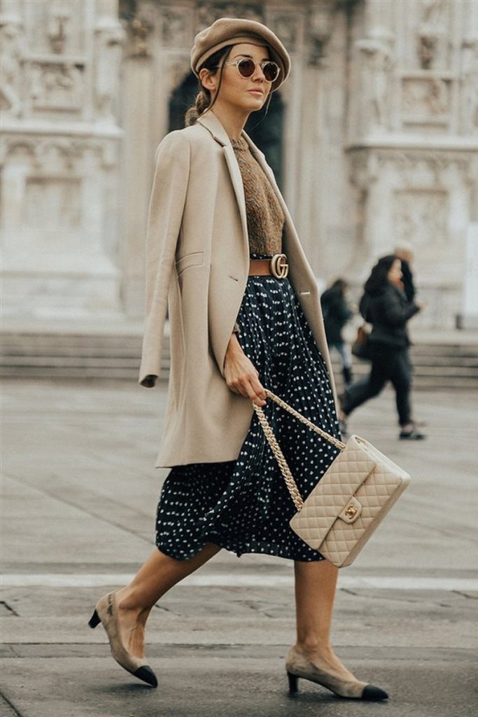 Si a la hora de ir de shopping ves las vitrinas llenas de nude y camel y decides irte con todo, ¡Excelente, este color luce bien de pies a cabeza! Puedes agregar diferentes variantes de este tono y entremezclarlas, una falda plisada midi (muy en tendencia esta primavera) con una ligera inclinación a los dorados y un suéter nude, más hacia los duraznos, crearán un look muy chic.